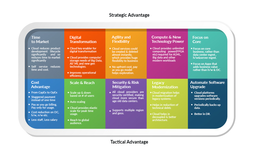 Among the numerous benefits of cloud adoption, the most significant ones can be grouped under strategic or technical advantages. The strategic advantages include reduced time to market, digital transformation, agility, flexibility, scalability, increased computing power, and enabling focus on core business. Cost advantage, scalability, legacy modernization, security and risk mitigation are some of the technical benefits.