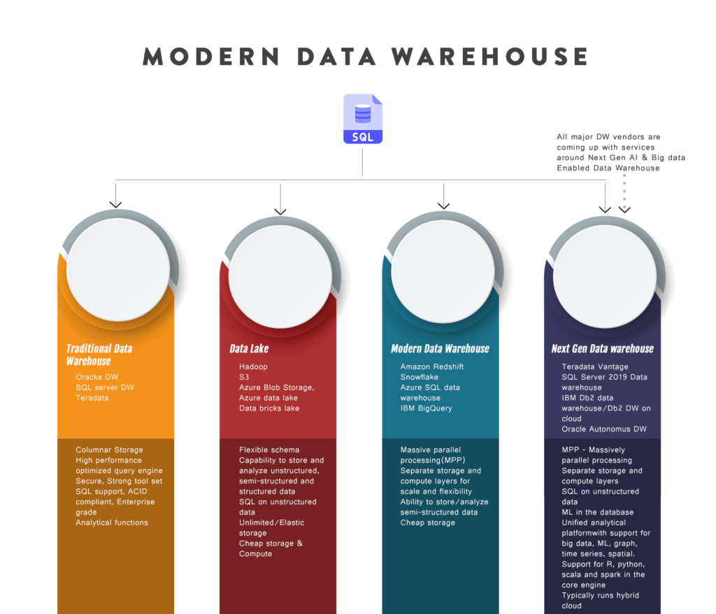 Traditional Data Warehouses are not aligned to today’s data needs or requirements. Modern Data Warehouses use the cheap elastic storage of cloud and can store and manage all types of data. They use Massive Parallel Processing (MPP) to parallelize queries to multiple machines/VMs and decouples the storage layer from the processing layer which is a typical characteristic followed by cloud systems. These are also more cost efficient when it comes to storing petabytes and exabytes of data.